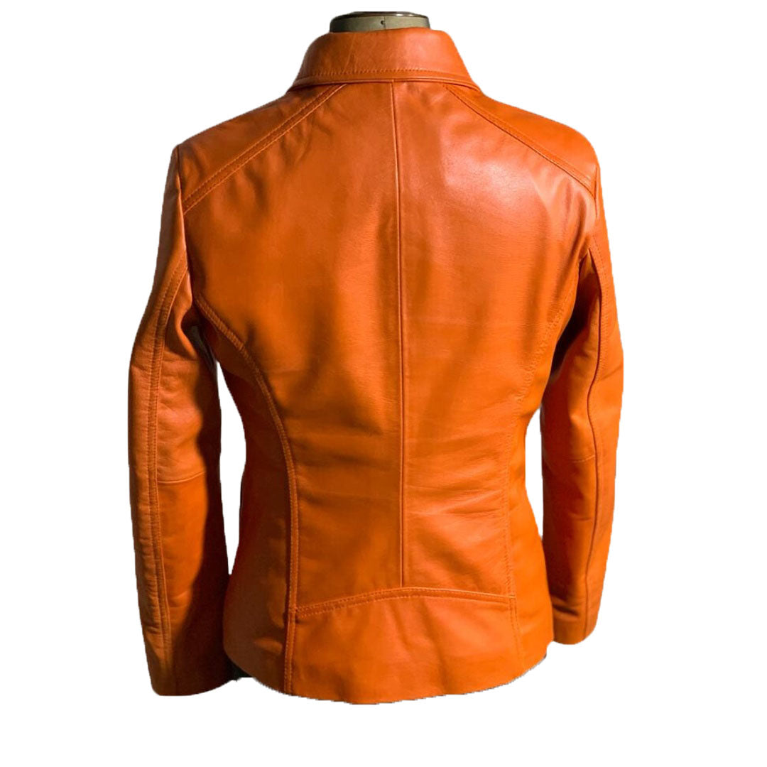 Do you want a stylish and trendy leather jacket having flap collars to mesmerize the crowd? Then, the Amelia women’s orange leather jacket – a stunning addition to any wardrobe. Crafted from premium quality leather, this jacket is durable and long-lasting. The vibrant orange color is bold and eye-catching, perfect for those who love to stand out.
