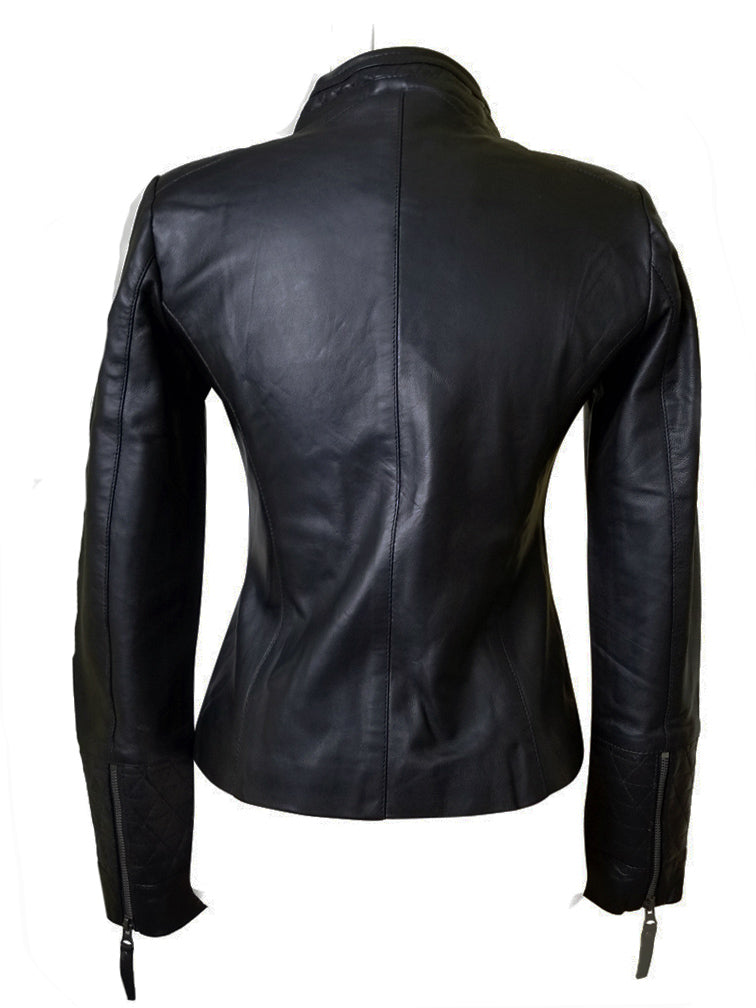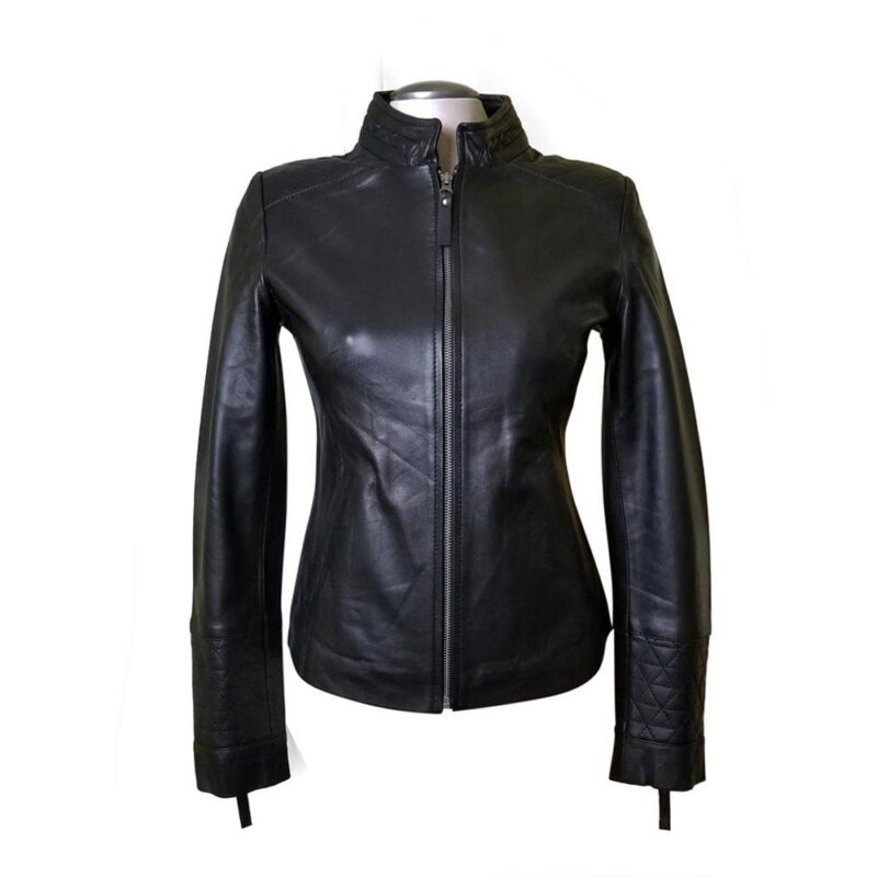 If you want to rock at any event in gorgeous outwear, then you must go for Arianne’s plain leather jacket with straight collar that will make your occasion memorable. Its great fabrication of full-grain leather makes it warm and luxuriant and the soft satin polyester inner will comfy you for how long you wear it. Arianne’s plain leather jacket has a glossy black color that will enhance your personality. The jacket has great features like a straight collar having a pattern, smooth zippered closure, and open hem zipped cuffs. The design on the shoulder, collar and cuffs make this jacket a must-have outwear in all fashion lovers’ wardrobes.