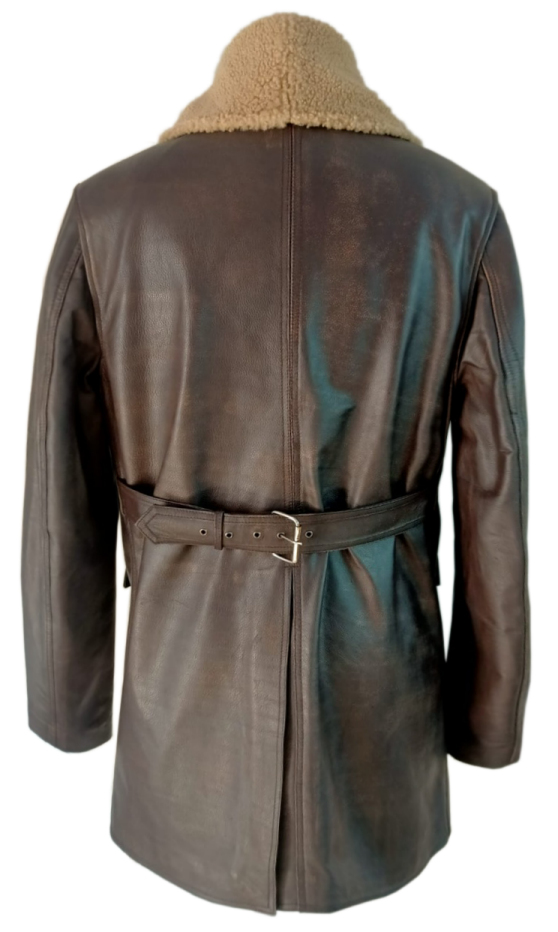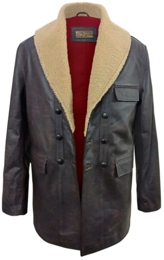 - Shown in distressed dark brown goatskin with genuine fur collar