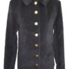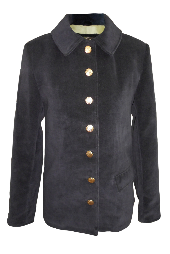 This cotton velvet jacket features a single-breasted brass button closure and traditional bomber collar. There is one off-set flapped pocket on the left hip. The back and sleeves are plain for a minimalistic look.