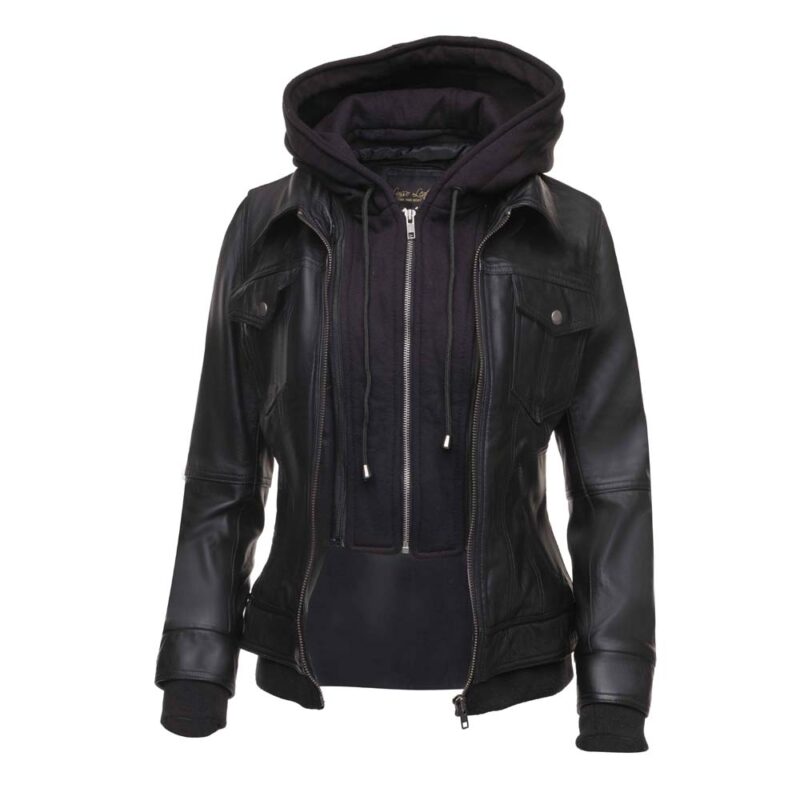 Leather jackets have become a trendy outwear and every woman wants one in her closet. Therefore, we put a lot of effort into designing this amazing Daphne’s Black Leather Jacket With Fleece Hoodie for women that will make you stand out and give you the confidence to flaunt it. You can wear this Daphne’s Black Leather Jacket With Fleece Hoodie for casual outings and night rides. To ensure your comfort, the outer layer is made with full-grain leather material, and the inside is lined with satin polyester fabric. It has a lapel-style collar, a front zipper closure, and ribbed cuff sleeves. This jacket has an asymmetric zipper lining as well as a removable fleece hoodie.