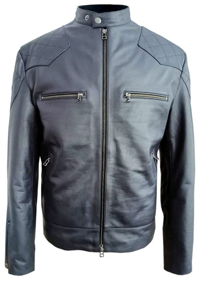 This cafe racer style jacket features quilt-stitched reinforced panels on the shoulders and elbows, several zippered pockets, zippered sleeve cuffs and double buckled straps on the waist. The jacket is fully lined with a vertical interior pocket and quilt-stitched satin sleeves.