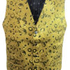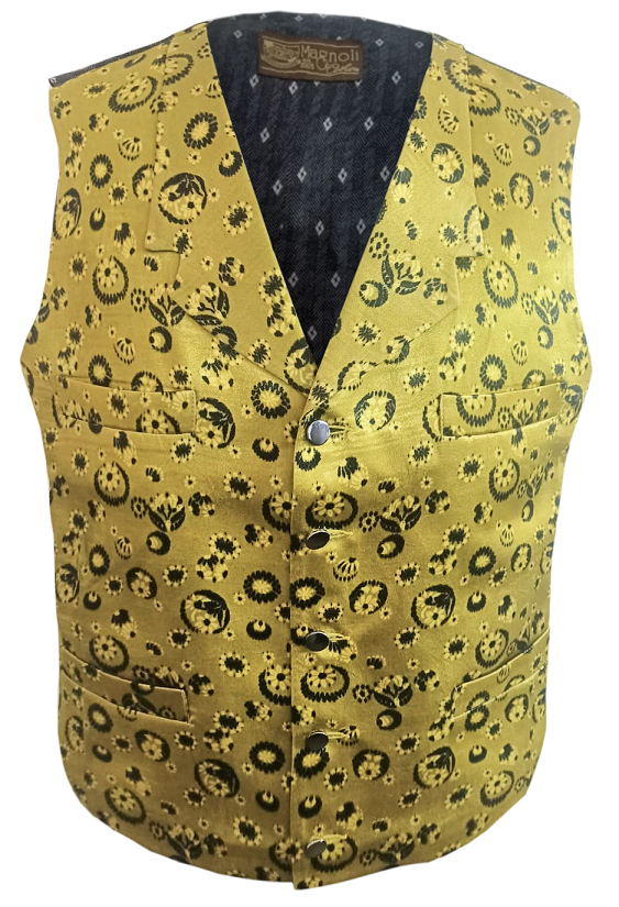 These garish Old West style waistcoats features a five-button, single-breasted closure, droop-cut notched lapels, four welted breast pockets, a matching collar panel at the neck and adjustable half-belt at the back. Available in two versions: