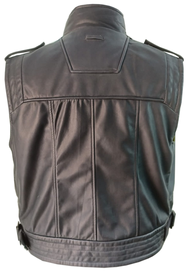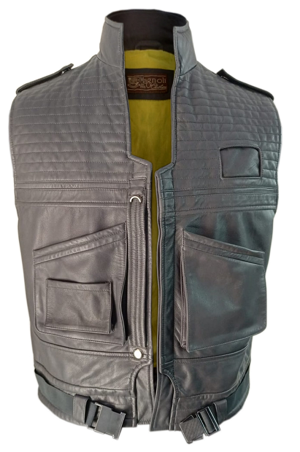 Similar to our Erso Vest, this leather spacer vest features quilt stitched shoulders, several top-entry pockets, snapped epaulets and a buckled waist.