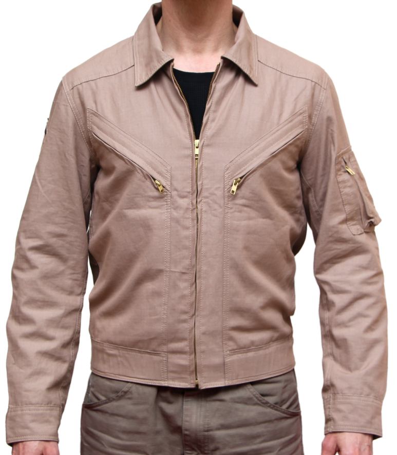 Based on our Paranormal Jumpsuit, this military-style jacket features a classic bomber collar, sleeve pocket, as well as two large front pockets that are accessible from top entry brass zippers as well as hand warmer slots on the sides. The back has gusseted shoulders and an elasticated waist. Fully lined in cotton with interior pockets.