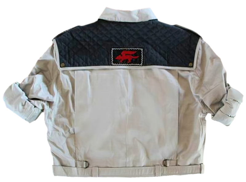 This casual cotton jacket features multiple pockets, snaps and straps giving it a utilitarian and slightly military look. The shoulder panels are quilt stitched with an embroidered patch on the back. Fully lined with interior pockets.