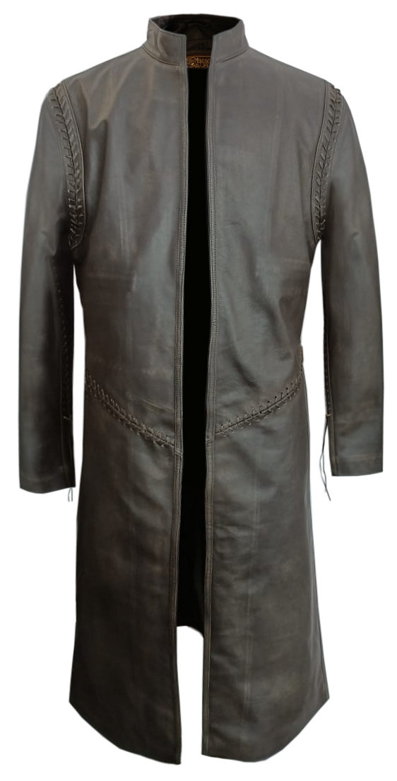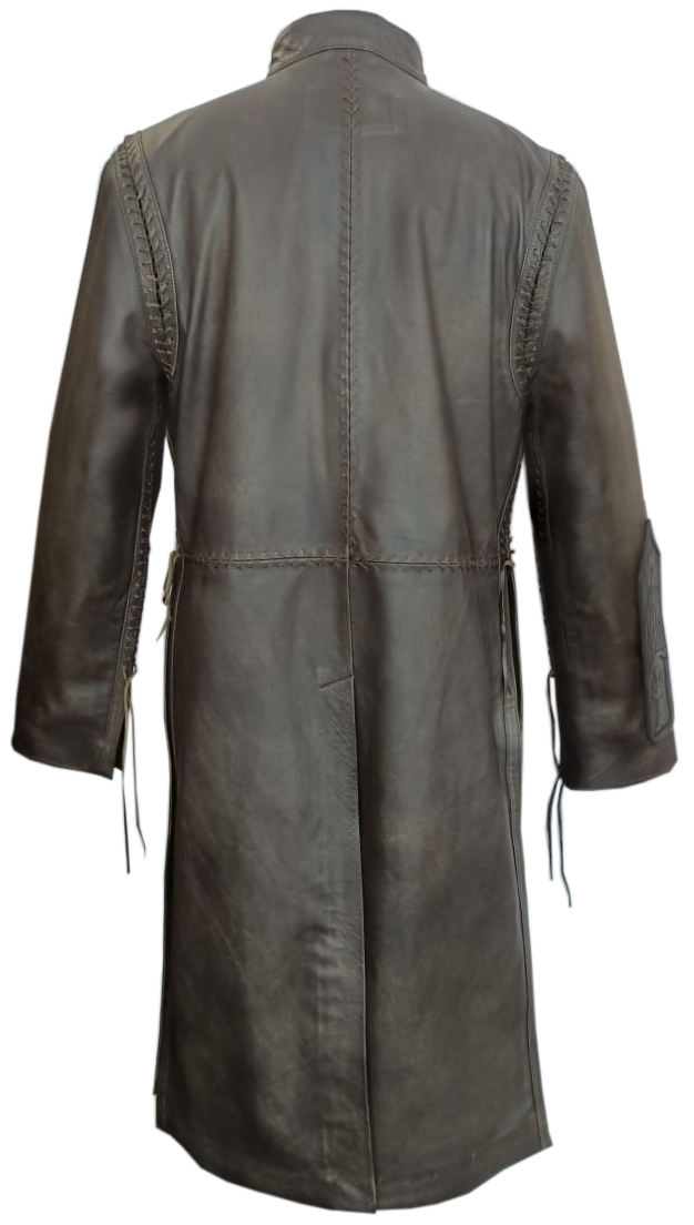 This leather duster features hand stitched detailing on the shoulders and waist, as well as lacing on the inner cuffs and sides. Long vents at the sides and back allow for greater mobility on foot or horseback. The right forearm has a custom made bracer with either an embossed Gondorian design or a simpler hand-stitched Ranger pattern (please state your preference in the comments section of your order).
