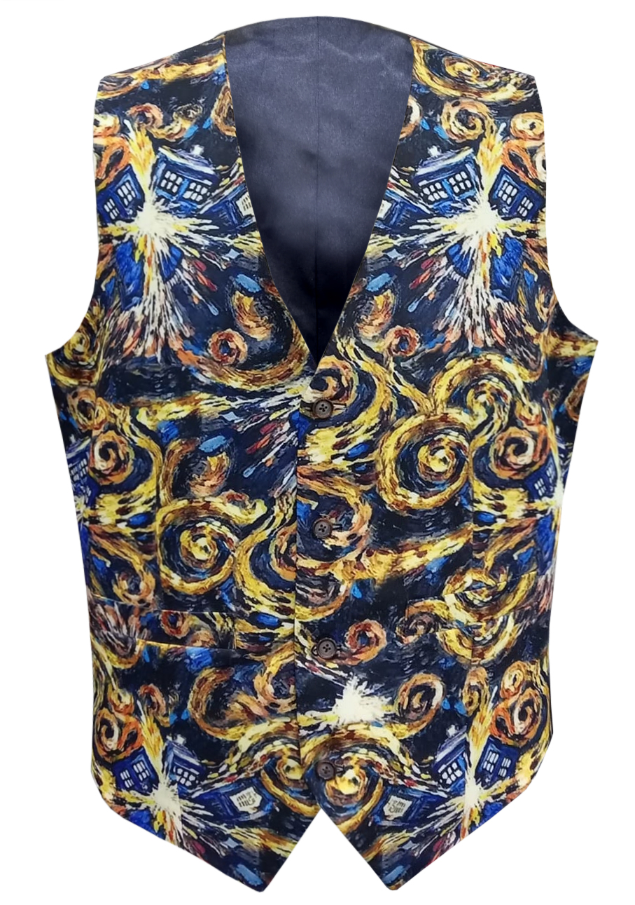 This quirky four-button vest features a professionally printed Van Gogh style painting on the front with a matching colored satin at the rear. The vest has two front pockets and an adjustable half belt on the back.