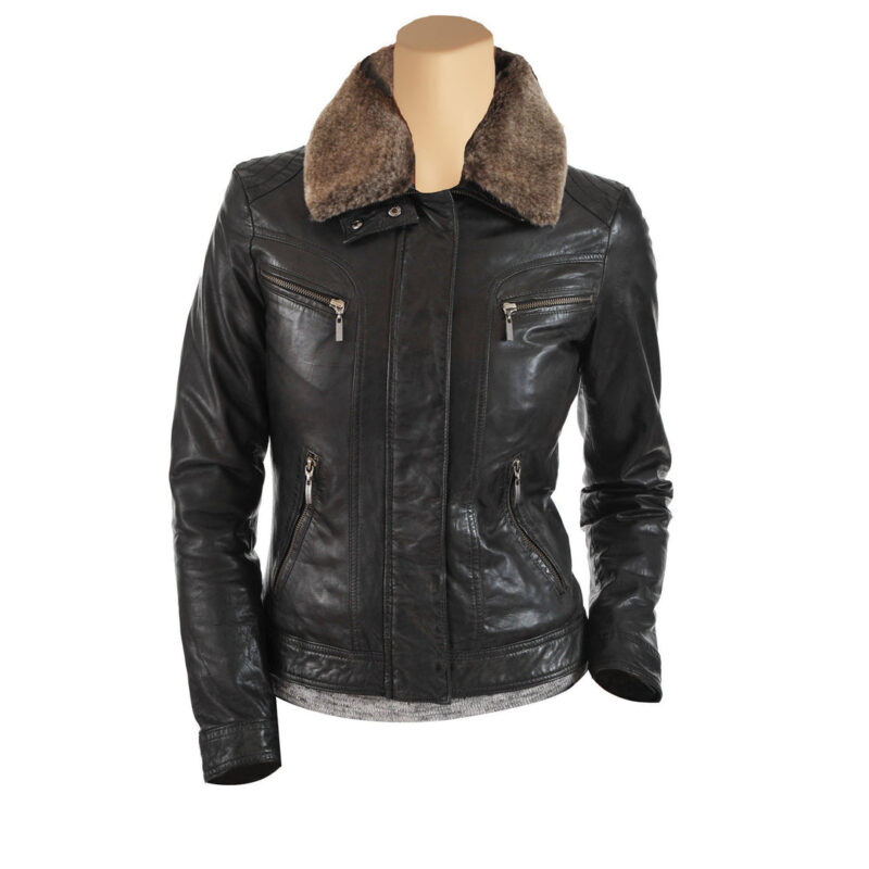 Womens Black Leather Jacket With Brown Fur Collar